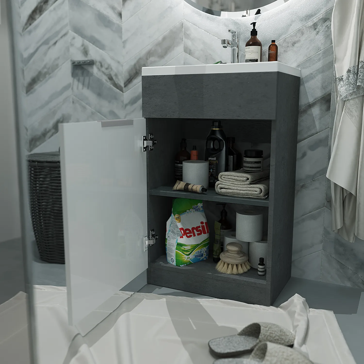 Лаконичная, стильная и невероятно доступная, эта тумба с раковиной заслуживает внимания всех, кто находится в поиске мебели для ванной комнаты, сочетающей в себе эстетику, долговечность и привлекательную стоимость. Ее дизайн отвечает всем современным тенденциям и построен на четкой геометрии. Надежные и качественные материалы исполнения отвечают за устойчивость к влаге и появлению разнообразных внешних дефектов. Продуманная конструкция раковины помогает избежать расплескивания воды и прочих неудобств, а сдержанная цветовая гамма подойдет для абсолютно любых интерьеров.Характеристики: